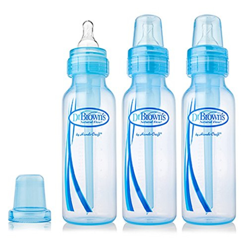 You and your little one will enjoy bottle-feeding with the Dr. Brown's 8-Ounce Baby Bottles 3-Pack in the Blue style, which allows air to channel from the nipple collar to the back of the bottle to help prevent bubbles and feeding problems such as colic, spit-up, burping and gas. Two-piece internal vents create positive airflow for vacuum-free feeding without nipple collapse. Air never mixes with the breast milk or formula, helping to prevent oxidation and maintain essential vitamins. The bottles are free from BPA, PVC, lead and phthalates.Product Feature