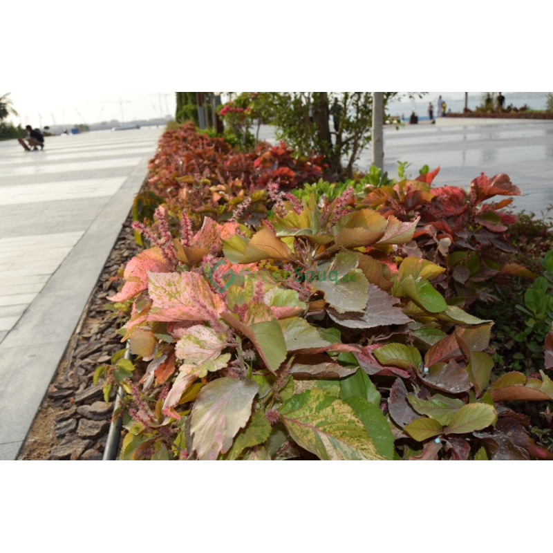 Acalypha wilkesiana tri color is spreading shrub, with oval, multi-colored, mottled, and often variegated leaves, 10-20cm long. Bears catkin-like racemes, 10- 20cm long, usually green or copper-tinted, and often hidden among the leaves, periodically during the year. Height 2m, Spread 1- 2m. Native to Pacific Island.