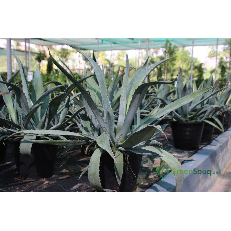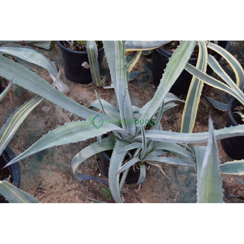 Agave americana “Century plant” has no stem. Its thick and massive gray-green leaves originate from a basal rosette. The leaves get up to 6′ long and 10″ wide, and have sharp spines on the margins and tips. The margin spines are recurved like fishhooks and the tip spines can be more than an inch long. The flower stalk is branched, 20-40′ tall, and bears large (3-4″) yellow-green flowers. Popular cultivars are ‘Marginata’ with yellow margins on the leaves, ‘Mediopicta’ with a broad yellow band down the center of each leaf, and ‘Striata’ with stripes.