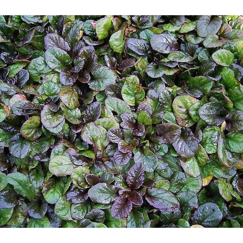 Ajuga reptans is carpet bugleweed is a low growing evergreen perennial 6-10 in (15.2-25.4 cm) tall which forms a dense matlike groundcover as it spreads along underground stolons. As is typical of herbaceous plants in the mint family, bugleweed has square stems and opposite or whorled leaves. The basal leaves are dark green and oblong or spoon shaped, 3-5 in (7.6-12.7 cm) long and 1-2 in (2.5-5.1 cm) wide; stem leaves are a little smaller. The flowers (usually blue or purplish) are about 1/2 in (1.3 cm) long and borne in whorls on erect spikes 6-10 in (15.2-25.4 cm) tall. They are typical mint flowers: tubular with two unequal lips. Many cultivars have been selected for foliage or flower color. ‘Alba’ has white flowers. ‘Rubra’ has rosy red flowers. ‘Pink Elf’ has pink flowers and gets only about 2 in (5.1 cm) tall. ‘Jungle Bronze’ has bronze leaves and flower spikes to 10 in (25.4 cm) tall. ‘Jungle Beauty’ has unusually colorful foliage, consisting of purple leaves with red margins. ‘Purple Brocade’ has leaves variegated with purple. ‘Multicolor’ or ‘Rainbow’ has leaves variegated with cream and pink. ‘Variegata’ has gray green leaves variegated with cream.