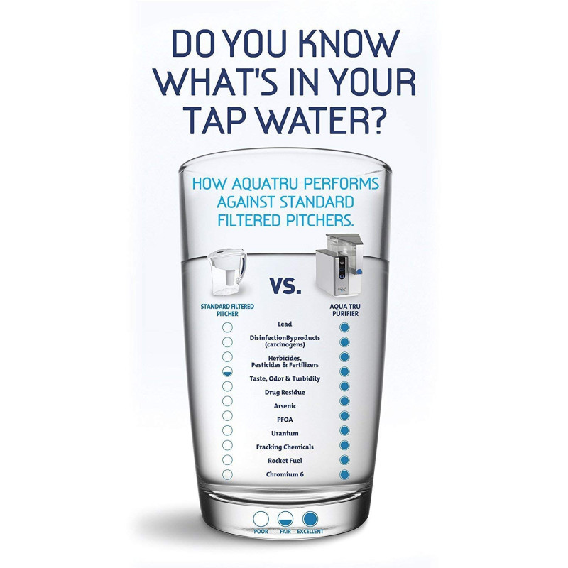 - QUICK CHANGE TWIST AND SEAL FILTERS come included with your first AQUA TRU system, and last from 6 months to 2 years. SLEEK COMPACT DESIGN - 14'' Tall x 14'' Deep x 12'' Wide - Purifies 1 gallon of tap water into bottle-quality water in 12-15 minutes. AQUA TRU water purification system is backed by our 30 day unconditional 100% Satisfaction Guarantee. If you’re not satisfied with our water filter for any reason, please let us know and we will provide you with a no questions asked refund.