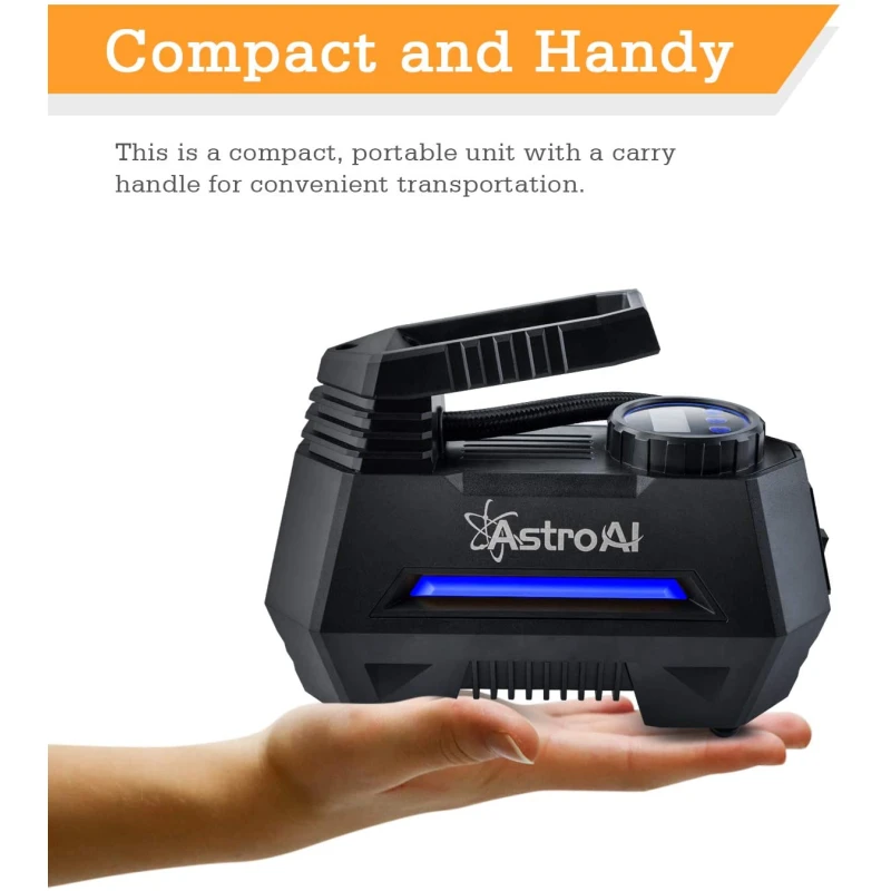 The AstroAI 100PSI portable air compressor inflates car tires and other inflatables quickly and easily. Just preset your desired tire pressure into the programmable LED screen, it will inflate tires to the desired pressure in a flash and then automatically shut off when the proper tire pressure is reached.