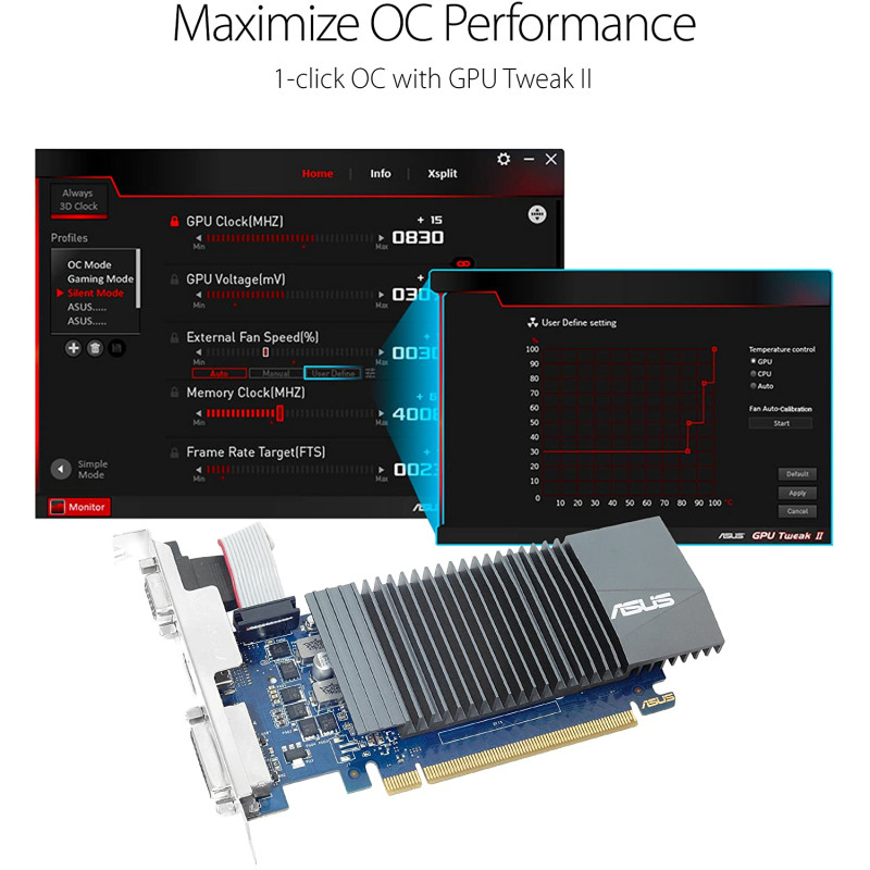 ASUS GT 710 is the fantastic graphics card engineered with a highly-efficient 0dB thermal design, it dissipates heat in complete silence and makes ASUS GT 710 the perfect choice for your PC build. 100% full automation for premium quality and best reliability. GPU Tweak II provides intuitive performance tweaking for truly elite gaming experience.