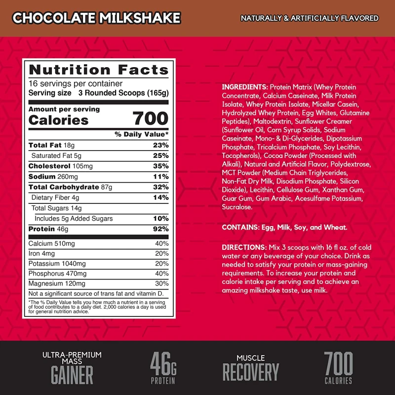 Recommended Use- Mix 3 scoops with 16 oz. of cold water or any beverage of your choice. Vary the amount of liquid to achieve your desired consistency. Drink 1 serving daily, or as needed to satisfy your protein or mass-gaining requirements. To increase your protein and calorie intake per serving and to achieve an amazing milkshake taste, use milk