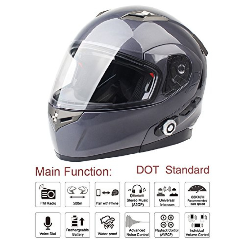 FreedConn Bluetooth Motorcycle Helmets Speakers Integrated Modular Flip up Dual Visors Full Face Built-in Bluetooth Mp3 Intercom headset Communication Range 500M (XL,Gray)