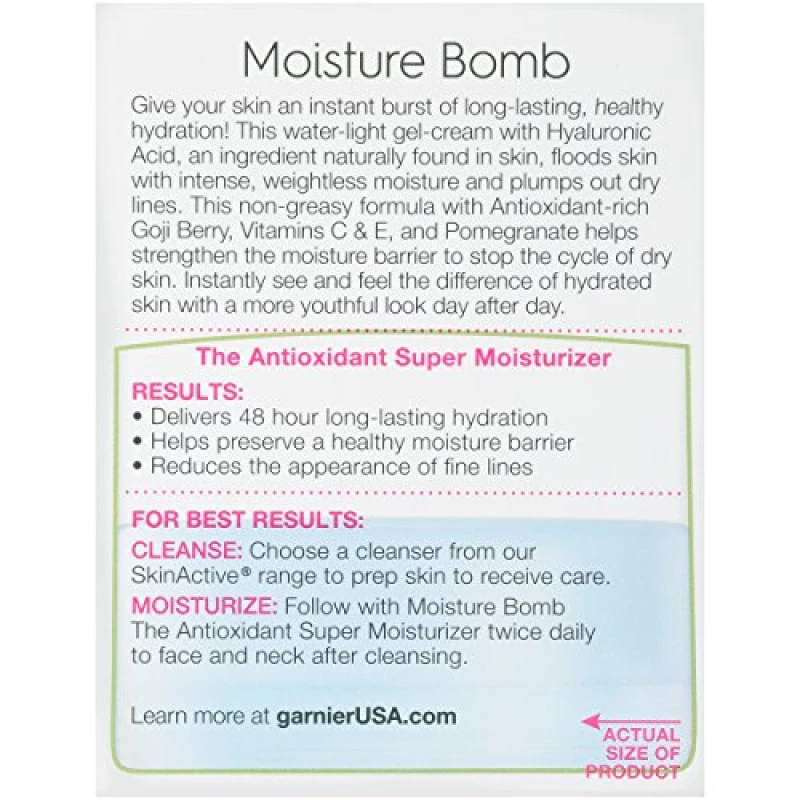 Garnier SkinActive Moisture Bomb Antioxidant Moisturizers with Hyaluronic Acid and Vitamin C and E. Discover the antioxidant super moisturizers that flood skin with long-lasting hydration. Now in a refreshing gel-cream moisturizer and SPF 30 face lotion. Formulated with Antioxidants Goji Berry & Pomegranate, these lightweight, antioxidant-packed formulas help strengthen and protect a healthy moisture barrier. The gel-cream face moisturizer has a sheer, water-light formula that floods skin with intense, weightless moisturize for softer, deeply hydrated skin. The SPF 30 moisturizing face lotion helps protect against daily aggressors, like harmful UV rays and provides lightweight daily moisture.