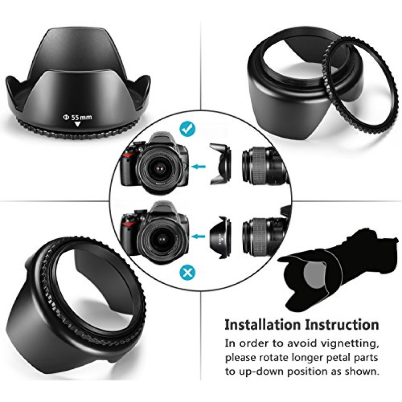 55mm 3 Piece Filter Kit (UV-CPL-FLD): UV filters reduce haze and improve contrast by minimizing the amount of ultraviolet light; CPL filters (Circular Polarizer) are great for removing unwanted reflections from non-metallic surfaces such as glass or water; FLD filters allow for shooting under fluorescent lighting