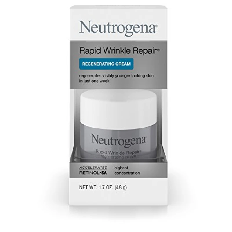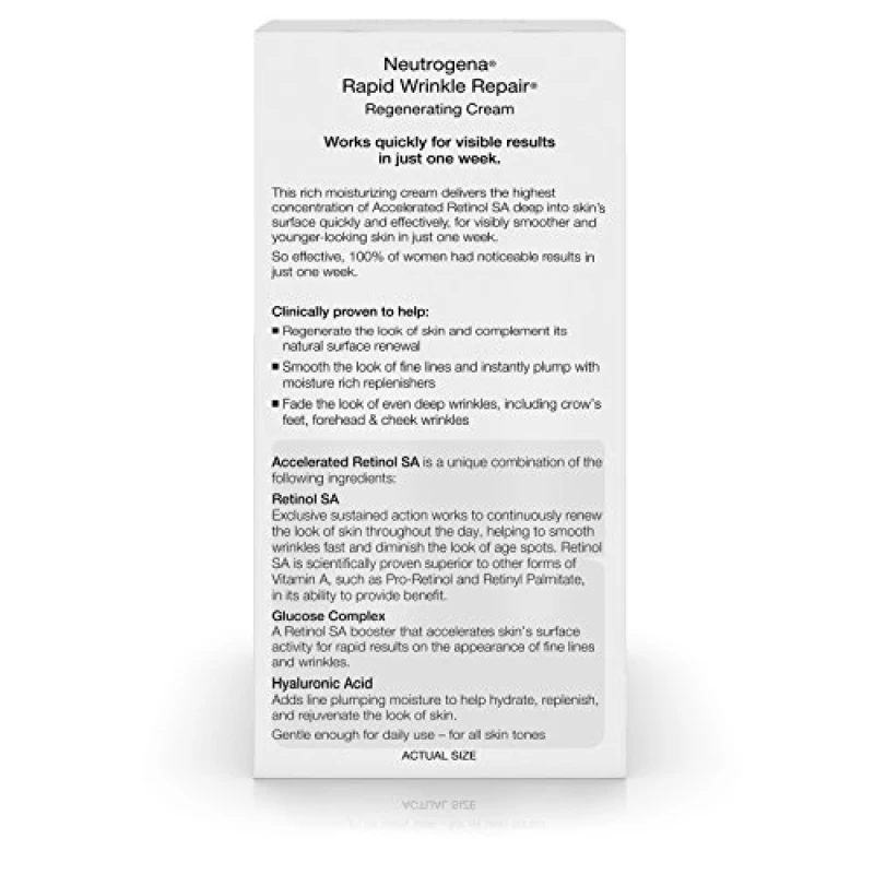 Reveal visibly younger looking skin in just one week with Neutrogena Rapid Wrinkle Repair Regenerating Cream. This anti-wrinkle face cream contains a unique combination of ingredients that helps regenerate, moisturize, and smooth your skin. Formula with Retinol SA works to continuously renew the look of your skin by helping reduce the look of wrinkles and diminish the look of age spots. The moisturizing face cream also contains Glucose Complex, a Retinol SA booster that helps accelerate your skin’s surface activity for rapid improvement in the appearance of fine lines and wrinkles. This anti-wrinkle cream contains hyaluronic acid, and helps hydrate, replenish and rejuvenate the look of dull skin. Neutrogena Rapid Wrinkle Repair is gentle enough for daily use.Product Feature