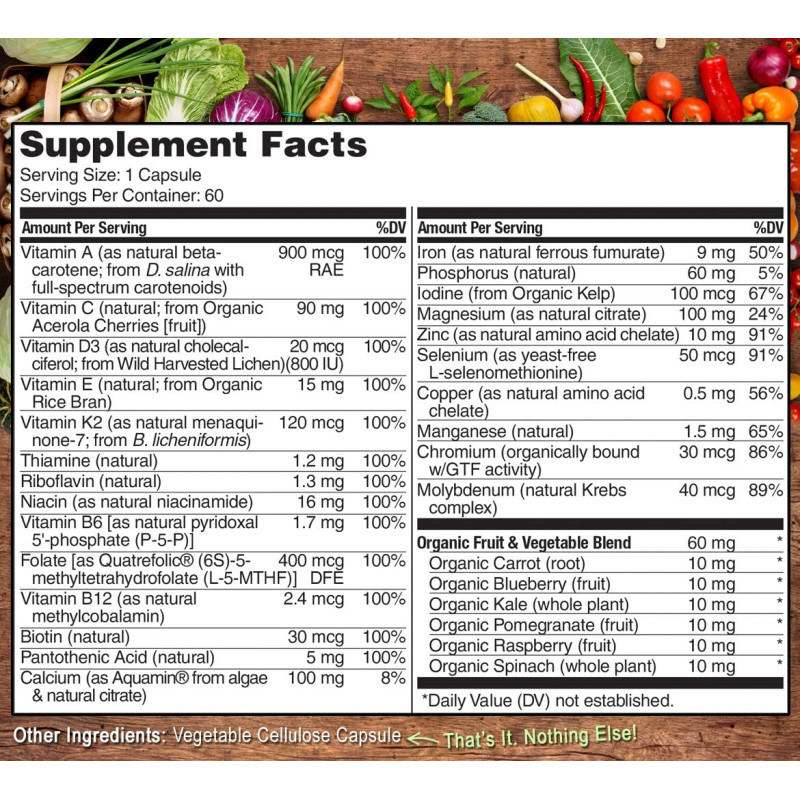 ★ Contains NATURAL Vitamins A, B Complex, C, D3, E, K2 ★ Minerals - Calcium, Magnesium, Zinc, Selenium, Potassium ★ Antioxidants from ORGANIC Fruit and Vegetable Extracts★ GMO Free ★ Soy Free ★ Gluten Free ★ No Gelatin ★ No Preservatives, Coloring or Flavoring