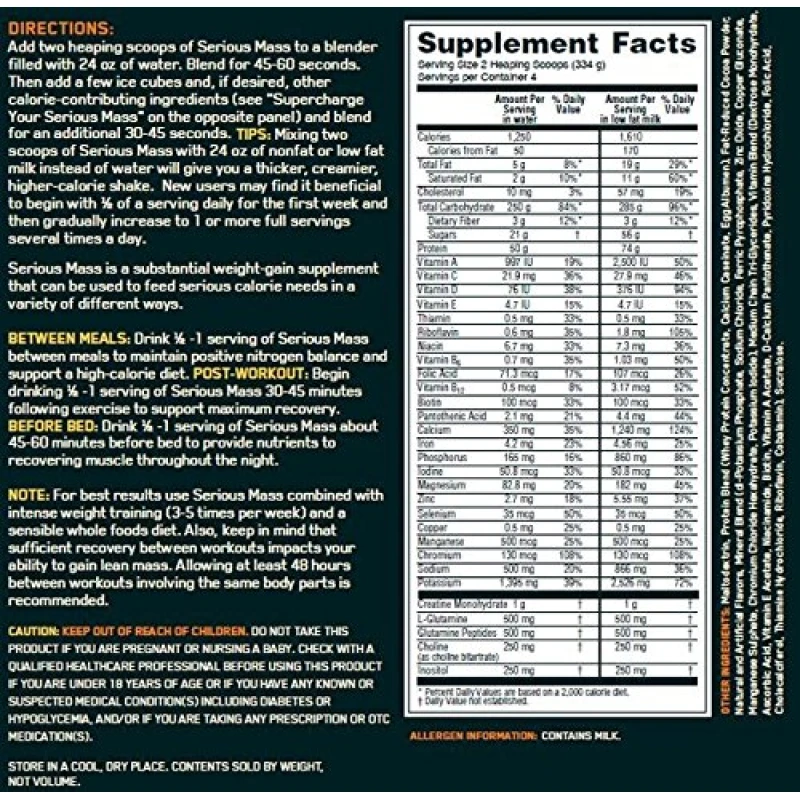 Serious Mass is the ultimate in weight gain formulas. With 1,250 calories per serving and 50 grams of protein for muscle recovery support, this instantized powder makes the ideal post-workout and between meals shake for sizing up your goals. Serious Mass provides you with the tools you need to pack on the pounds and help you develop the physique you’ve always wanted.Product Feature