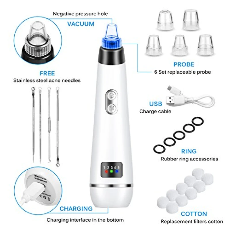 3. We will present a set of stainless steel acne needles placed at the bottom of the blackhead vacuum suction remover packaging box. The professional electroplated needle and stainless steel antibacterial coating won't cause sensitivity issues, helps easily cleans up the blackhead.