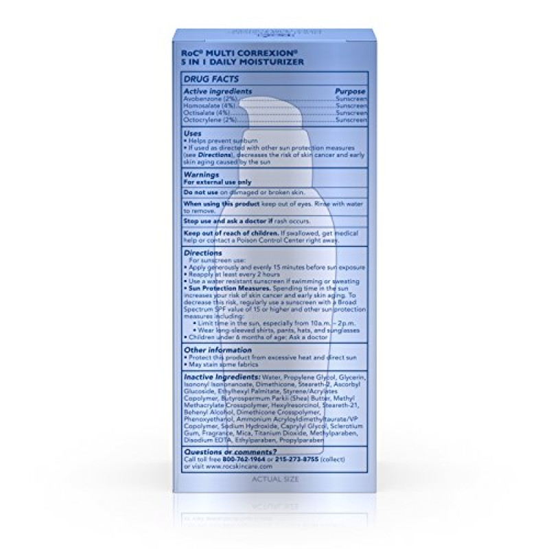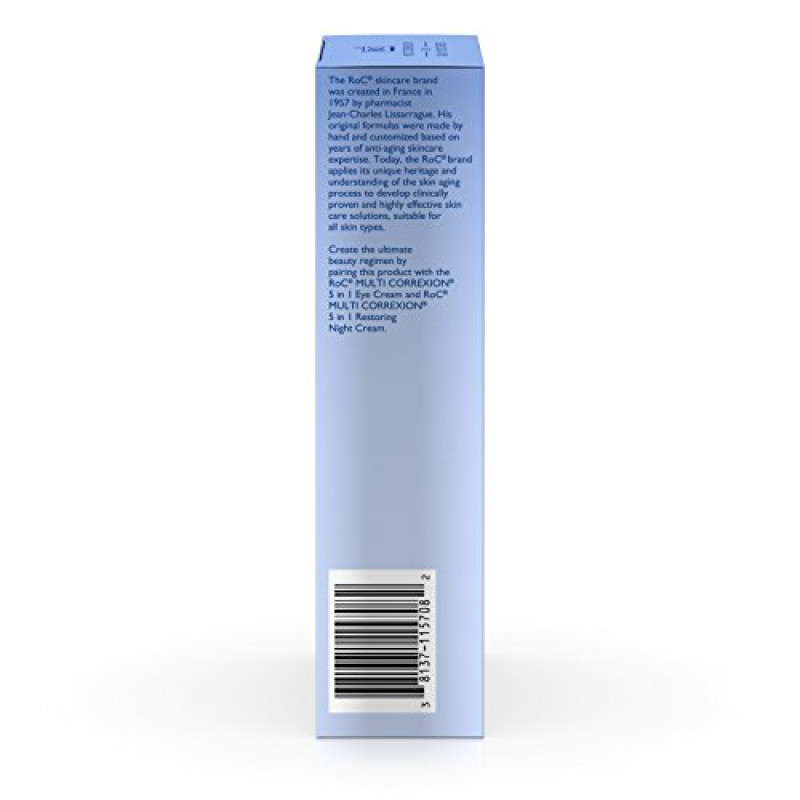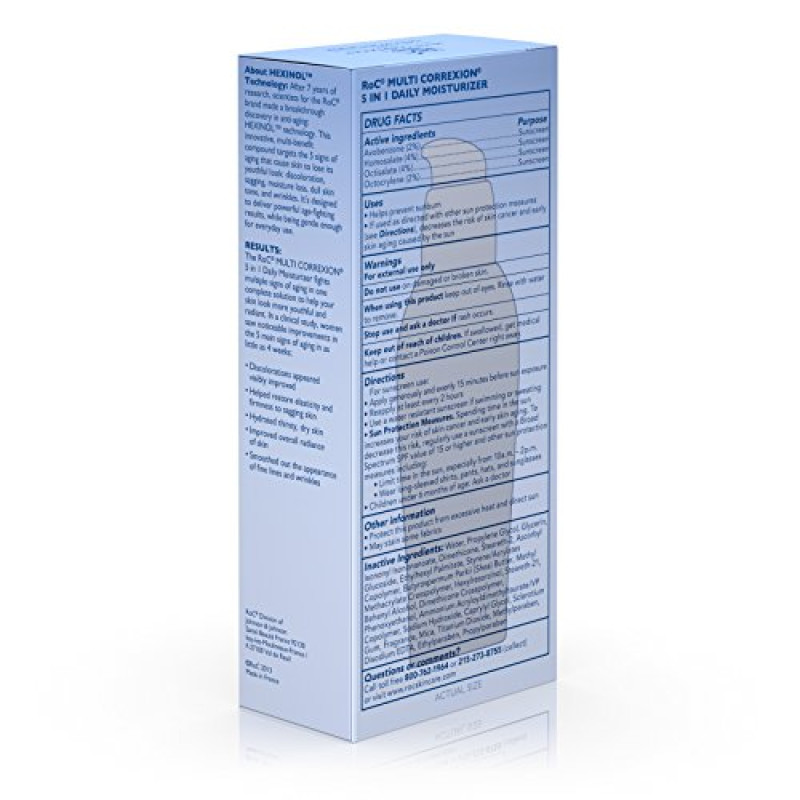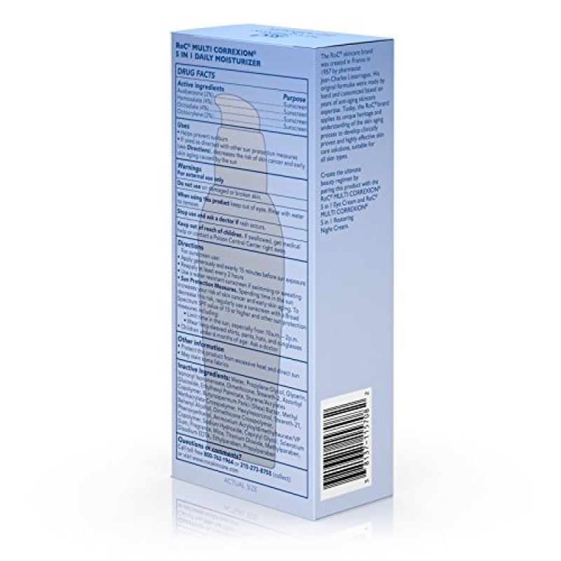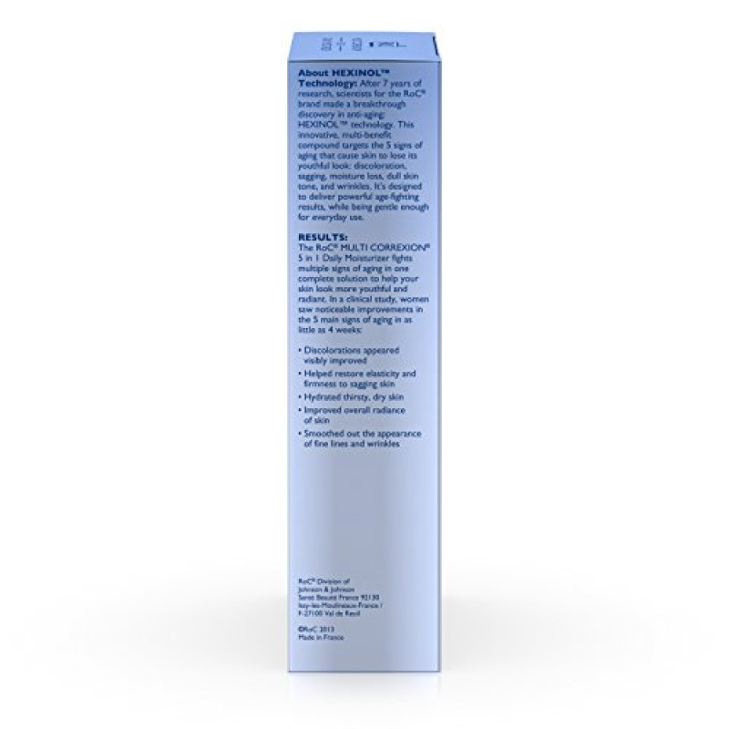 RoC Multi Correxion 5-in-1 Daily Anti-Aging Facial Moisturizer helps fight multiple signs of aging in one formulation for more youthful, radiant looking skin. In a clinical study, women saw noticeable improvements in just four weeks, including visible reduction in appearance of discoloration, restored elasticity and firmness, and smoother appearance of fine lines and wrinkles. Featuring Hexinol Technology, this daily anti-wrinkle cream helps improve the five main signs of aging in your skin while also helping to improve skin discoloration. It helps reduce the appearance of fine lines and wrinkles, loss of firmness and elasticity, loss of radiance, and unevenness of skin tone. It also contains Broad Spectrum SPF 30 sunscreen to help protect skin from UVA and UVB rays, which may contribute to premature aging. Simply apply to clean, dry skin fifteen minutes before sun exposure and reapply every two hours.Product Feature