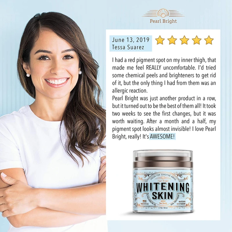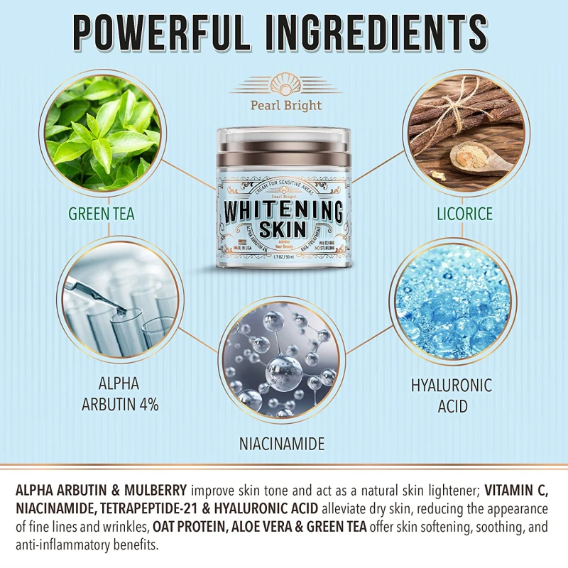 - FLAWLESS SKIN FOREVER - PEARL BRIGHT whitening skin cream is the most advanced skincare development. While other brightening products have Kojic acid, which has side effects, we choose the safe Alpha Arbutin. Thus we create the safest and most effective cream, which provides perfect skin whitening for sensitive parts, such as bikini and underarms. Enjoy clean, delicate, and pleasant skin.