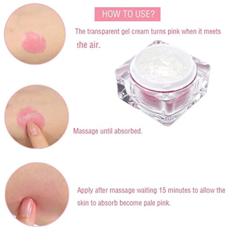 First rub the gel, in a short while become pink, the area required for the application, massage until absorbed every day, it could restrain synthesis of melanin, Insist on using, gradually become whitening.