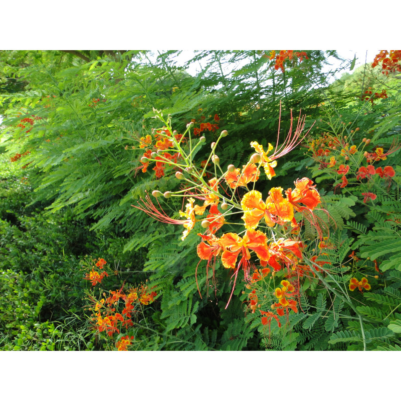 Caesalpinia pulcherrima is erect shrub or small tree with long-stalked, 2-pinnate, light green leaves, 30cm or more long, composed of numerous elliptic to obovate leaflets, 8mm long. From spring to autumn, bears erect racemes, to 20cm long, of up to 40 irregularly bowl-shaped flowers, 3-4cm across, with orange-yellow or yellow petals, orange-red sepals, and red stamens. Height 3-6m, Spread 2-4m. Probably native to West Indies.