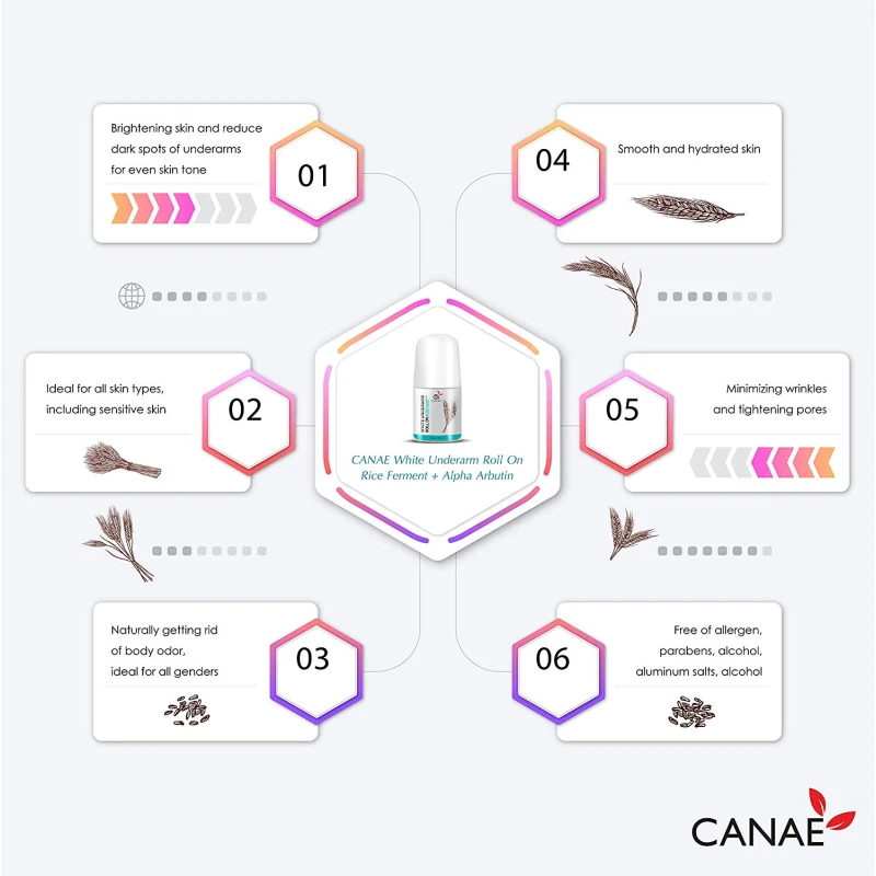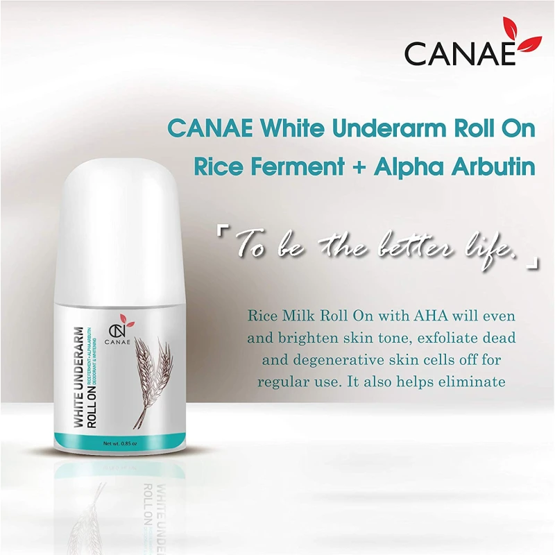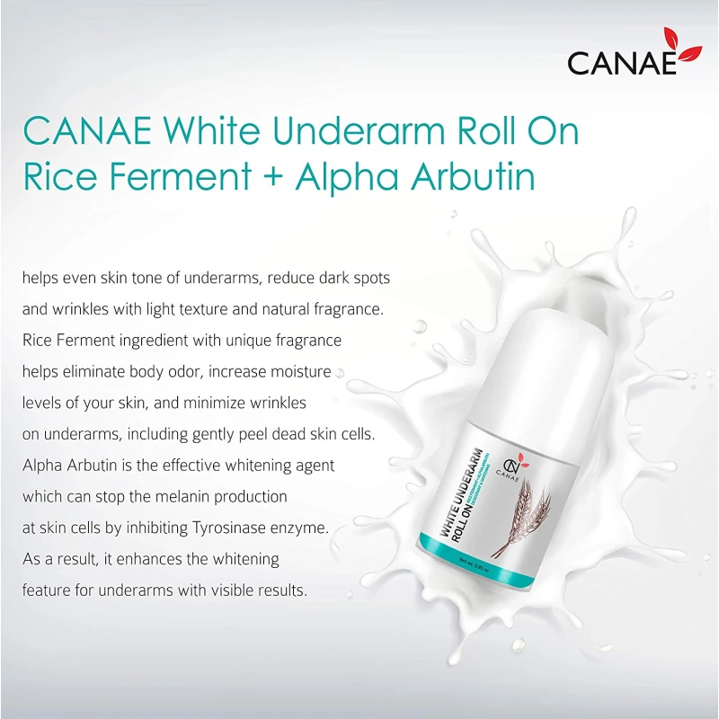 CANAE Underarm Whitening Roll On helps even skin tone of underarms, reduce dark spots and wrinkles with light texture and natural fragrance. Rice Ferment ingredient with unique fragrance helps eliminate body odor, increase moisture levels of your skin, and minimize wrinkles on underarms, including gently peel dead skin cells. Alpha Arbutin is the effective whitening agent which can stop the melanin production at skin cells by inhibiting Tyrosinase enzyme. As a result, it enhances the whitening feature for underarms with visible results.