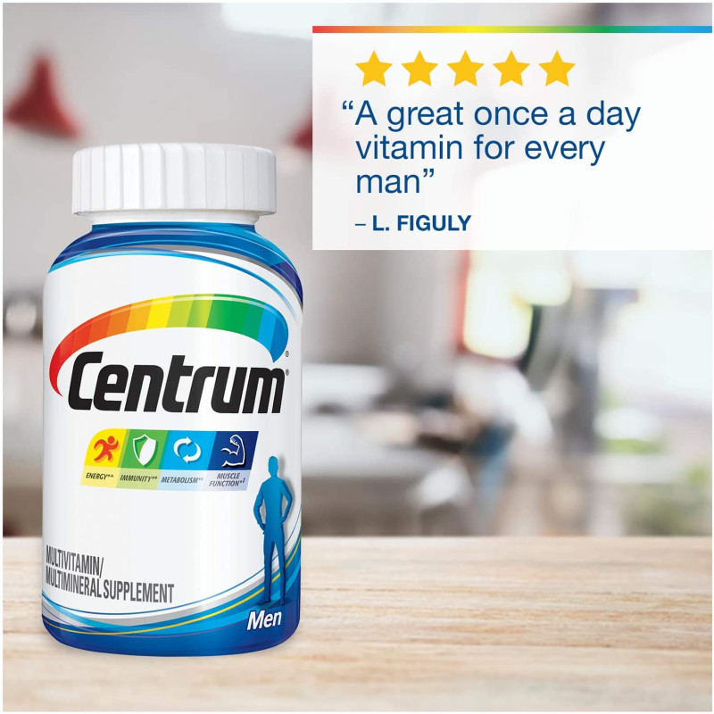 Size:250 Count (Pack of 1)Centrum Multivitamin for Men is the most complete multivitamin/multimineral supplement specially formulated for men, containing Centrum's highest levels of Vitamin D3 for healthy muscle function. These daily vitamins for men deliver antioxidants such as zinc and vitamins E and C for immunity support, and energy supplements such as B vitamins to support your daily needs. Made with non GMO ingredients, this gluten free multivitamin for men also contains muscle and metabolism vitamins to help your body process fats, carbohydrates and proteins effectively. This bottle of 250 men's multivitamin tablets helps support a healthy lifestyle for about four months. Take one tablet daily with food. Feed your cells, fuel your life with Centrum, the #1 doctor and pharmacist recommended brand.