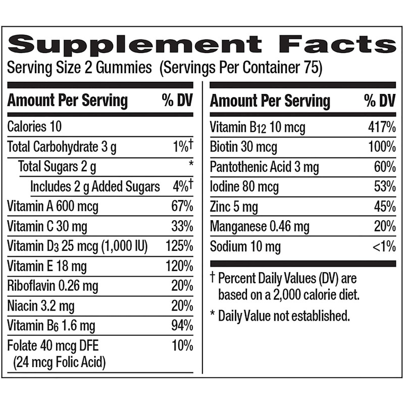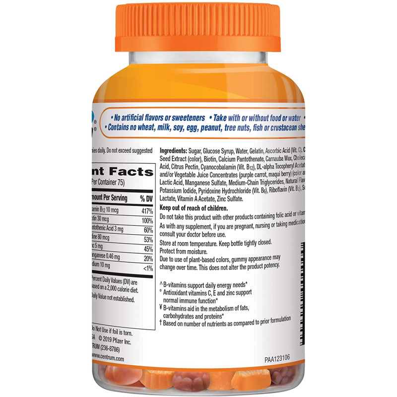 Centrum MultiGummies Gummy Multivitamin for Adults is a multivitamin/multimineral supplement that contains more vitamin D3 than any other gummy, delivering key nutrients that help support your energy, immunity and metabolism in an easy-to-take multivitamin gummy form. This great-tasting gummy multivitamin for men and women comes with 100% or more of the recommended daily value of vitamins B12, D and E. Each adult gummy multivitamin contains immune support supplement vitamins and energy supplements like B vitamins to help your body metabolize fats, carbohydrates and proteins. These assorted fruit-flavored multivitamin gummies for adults are made with natural fruit flavors and no artificial sweeteners. Support your body head to toe by taking two gummies every day with or without food or water. Feed your cells, fuel your life with Centrum, the #1 doctor and pharmacist recommended brand.