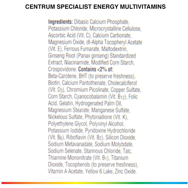 Centrum Specialist Energy Multivitamin is a daily supplement for adults that is specifically formulated to naturally help the body produce energy, while providing all the benefits of Centrum. With 100% or more of the daily value of 16 essential nutrients, Centrum is the most complete multivitamin for men and women. Centrum Specialist Energy is further enhanced with Ginseng and higher levels of B Vitamins (1) to help maintain vitality and well-being and to help support your energy needs without the use of stimulants like caffeine. A daily multivitamin is part of an overall healthy lifestyle and can help adults get the recommended amount of key vitamins and minerals. Help support your body head-to-toe with Centrum, the #1 doctor and pharmacist recommended brand (3).* (1) Compared to Centrum Adult Multivitamins (2) Energy: B-Vitamins and Iron support daily energy needs; Immunity: Vitamins C, E, Beta-Carotene and Zinc help support normal immune function; Metabolism: B-Vitamins aid in the metabolism of fats, carbohydrates and proteins.* (3) Based on IMS Health data (adult multivitamin brands in the US as of March 2017), and 2017 Pharmacy Times Survey of Pharmacists' OTC Recommendations. * These statements have not been evaluated by the Food and Drug Administration. These products are not intended to diagnose, treat, cure or prevent any disease.