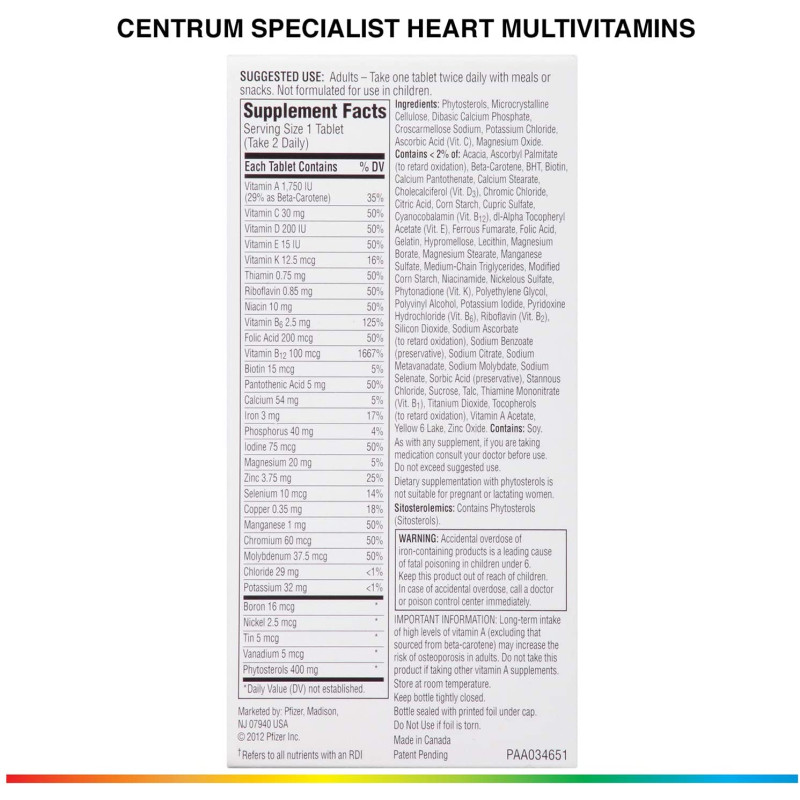 Centrum Specialist Heart Multivitamin/Multimineral Supplement is specially formulated to support your heart health, help maintain healthy blood pressure and support your circulatory system. These adult multivitamins contain phytosterols, calcium and super B complex vitamins such as B6, B9 (folic acid) and B12 to support heart health and help maintain blood pressure within a normal range. With micronutrients and vitamins C and E, beta-carotene and zinc, this heart health multivitamin also helps maintain whole body health by supporting normal immune function and healthy blood vessel function, while aiding in the metabolism of fats, carbohydrates and proteins. Each bottle contains 60 easy-to-take heart vitamin tablets. Take one multivitamin for adults with food twice daily. Feed your cells, fuel your life with Centrum, the #1 doctor and pharmacist recommended brand.