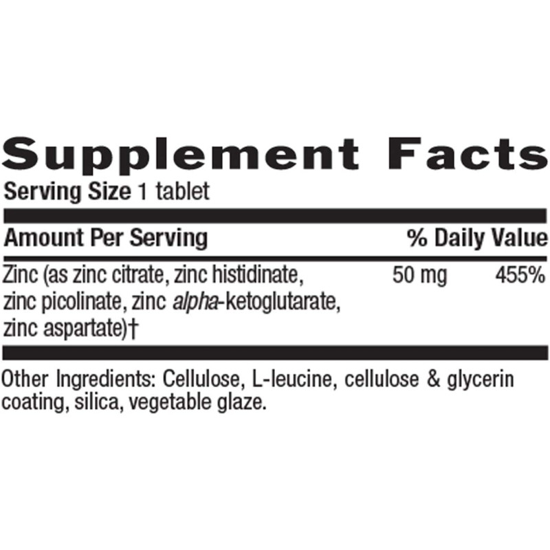 Zinc (as zinc citrate, histidinate, picolinate, alpha-ketoglutarate, aspartate) Amt Per Serving:50 mg % Daily Value :333%,,Other Ingredients: Cellulose, L-leucine, silica, cellulose and glycerin coating, silica, vegetable glaze.