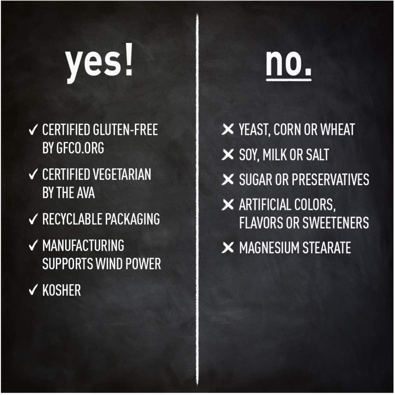 - CONTAINS ABSOLUTELY NO: Yeast - Corn - Wheat - Soy - Milk - Sugar - Preservatives - Artificial Color - Magnesium Stearate