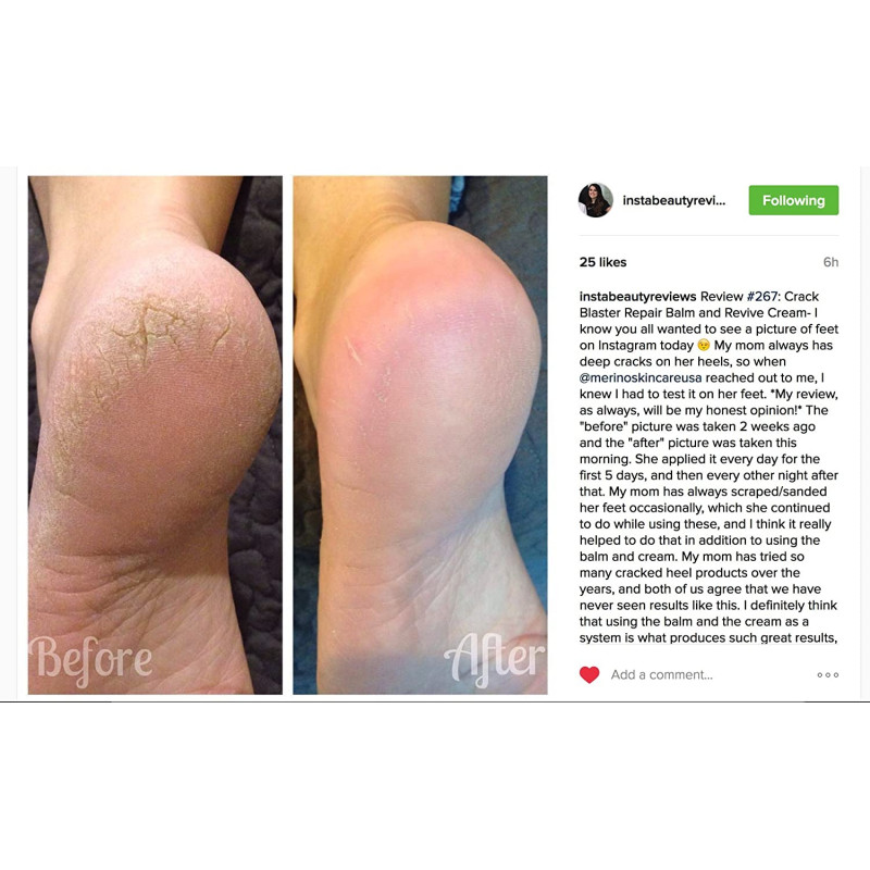 Relief for Cracked Heels, Fingertips, Lips, Hands, Elbows and more! Crack Blaster Repair Balm and Revive Cream were developed from over 25 years of helping 1000's with extremely dry, cracked feet, hands and problem skin. The 1-2 power punch of Crack Blaster Repair Foot & Finger Relief and Revive Foot and Body cream helps your skin to repair and revive itself with a combination of purified lanolin, jojoba, glycerin, vitamin e, aloe vera, vitamin c for fast crack relief! Crack Blaster Repair - is a thicker balm to use on the extremely cracked foot & finger areas and harder skin. It is soothing and penetrating and it has no stinky smell either. We made it that way as so many others have a lingering smell that is not pleasant...but also it does not interfere with your own perfumes, etc. Use this twice a day for fast results. Great on heels, fingers, lips, elbows, blisters, etc. Crack Blaster Revive - is a wonderfully rich cream to maintain the moisture balance your skin needs to prevent cracking and drying. It is the perfect compliment to the Repair Balm and can be used as your daily body moisturizer. It's also a great carrier cream for your favorite essential oils! A real no crack super hand cream and foot cream!