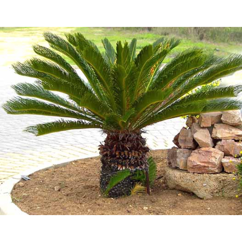 Cycas revoluta Cycad is robust-stemmed cycad, erect at first but gradually relining with age, and suckering and branching when mature. Arching leaves, 0.75-1.5m long, are pinnate, with up to 125 sickle-shaped, glossy, dark green leaflets. Ovoid, woolly, golden brown inflorescences are produced on mature plants but seldom on those grown in containers. The male inflorescences, to 40cm long, are pineapple-scented; females, 20cm long, produce ovoid yellow fruit, 3-4cm long. Height 1-2m or more, Spread1-2m or more. Native of Japan.