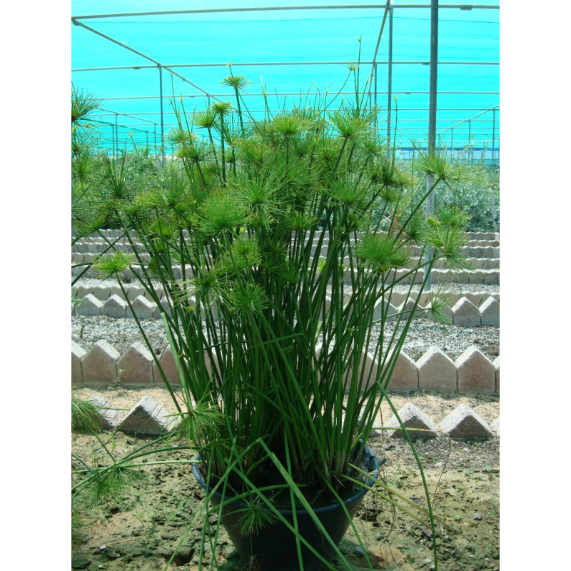 Cyperus haspan or dwarf Cyperus is clump-forming perennial with tall, 3-angled, pithy, leafless stems. Globe-like compound umbels of 100-200 thread-like rays, 12-30cm long, each ending in a tiny brown flower, become pendent with age. Ancient Egyptians flattened and dried the stems to make a form of paper. Needs high humidity. Height 2m, Spread 0.6-1.2m. Native of Egypt to tropical Africa.