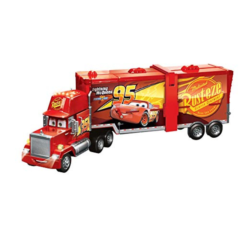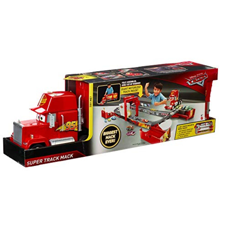 This huge Disney/Pixar's Cars Mack hauler packs two ways to play in one cool toy. Lightning McQueen's favorite truck has iconic Rust-Eze #95 sponsor panels and working headlights and cab lights. Drive him to your next competition as he makes iconic sounds. Park and separate the cab from the trailer to open and transform Mack into racetrack mode! Place your favorite character cars at the starting line and then use the booster to send them speeding at high velocity around the Piston Cup track. Mack's cab makes iconic racing sounds to enhance the excitement. Brave the banked course as you hear engines roar, horns honk, the crowd cheer and cars speed around. Vehicles sold separately, subject to availability.Product Feature