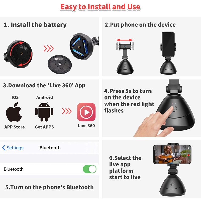 - Easy to use object face tracking phone holder: ➤ Install the 'Live 360'App, no required registration➤ Open 'Live 360', press and hold the power button for 5 seconds, the red light will light up➤ Open the phone's Bluetooth, the shooting camera holder will connect with the mobile phone automatically➤ Open the software that needs to be recorded or live broadcast, and it can be easily used without complicated tutorials