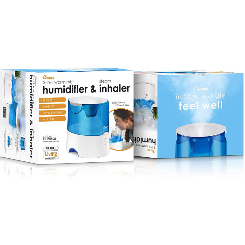 Crane's 2-in-1 Warm Mist Humidifier and Inhaler is the best solution for natural relief for symptoms caused by dry air, allergies, and especially cold and flu symptoms. Its half gallon tank runs whisper quiet for over 8 hours in a small or medium size room and the medicine cup attachment can be used with Crane's Lavender (HS-1950L) or Menthol (HS-1950) Vapor Pads. The inhaler attachment quickly converts it to a sinus inhaler for instant congestion relief and is a great non-medicated alternative to over the counter remedies. It's the perfect humidifier for congestion and symptomatic relief from cold and flu, and works great for bedrooms, dorms, and office spaces.