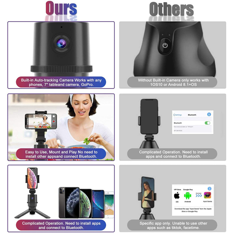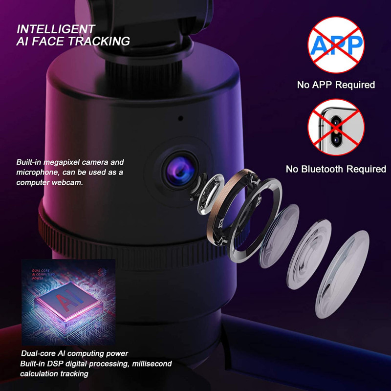 - 【No APP Required】This tracking tripod has a built-in megapixel and smart tracking camera. Not like other clumsy tripods, this unit has Convolutional Neural Networks for Visual Recognition. No need to download APP. No need to connect to Bluetooth. No complicated settings and links, this product is suitable for any mobile phone camera, GoPro and PC-camera.