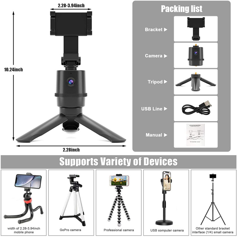 - 【Flexible and Portable】This auto tracking phone holder with adjustable width, it is not only suitable for 2.28-3.94 inch mobile phones but also used with GoPro cameras, pro camera, USB computer camera, including other standard stand port (1/4) small camera. No worry about OS support issue and smartphone CPU consumption.