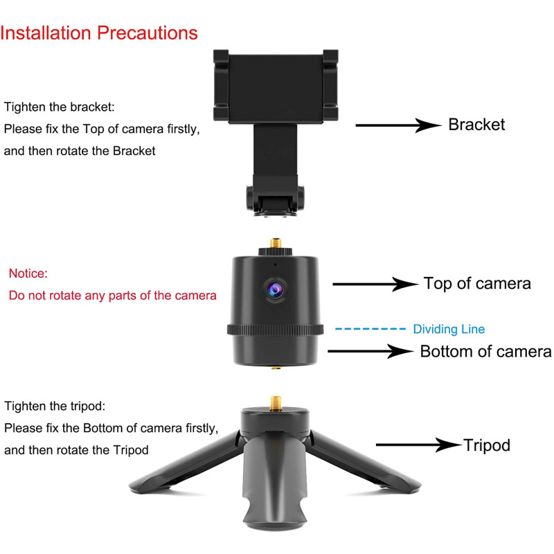 - 【Warm Tip】The bracket, the camera and the tripod are all separate. The bracket and tripod can be unscrewed separately. Please do not rotate the camera. If you manually rotate the middle part of the camera, the camera will stop working and need to be restarted for normal use.