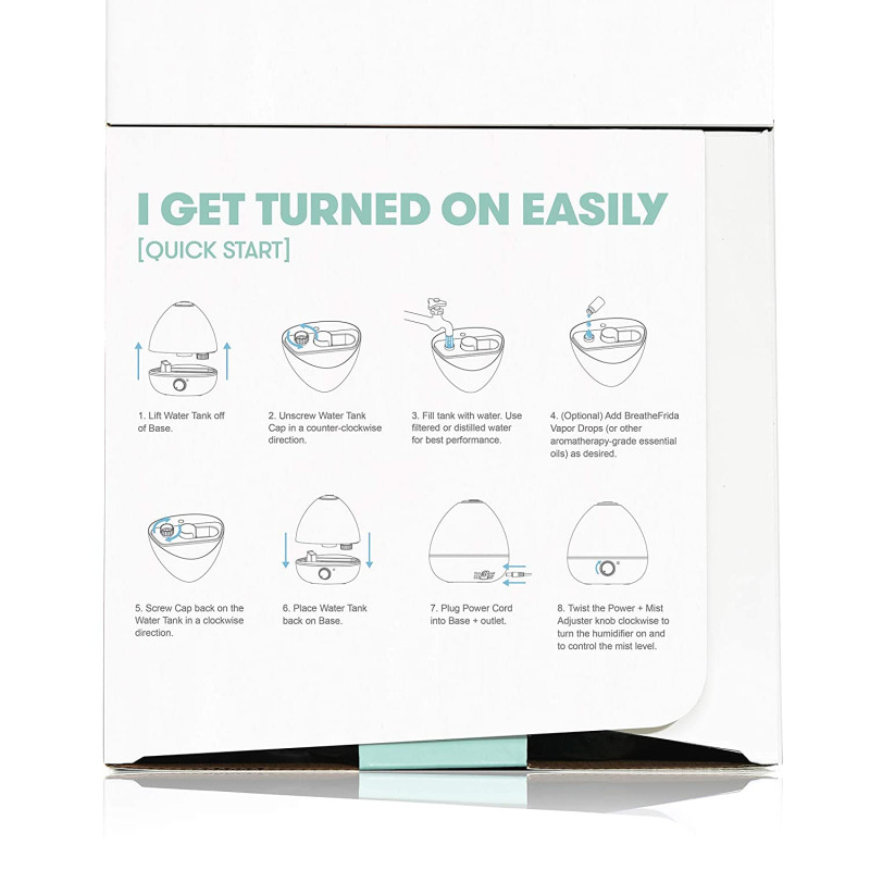 - DIFFUSER: Add Breath Frida Vapor Drops or any aromatherapy-grade essential oil for easier breathing - it covers up to 320 square feet with a 0.5 gallon tank.