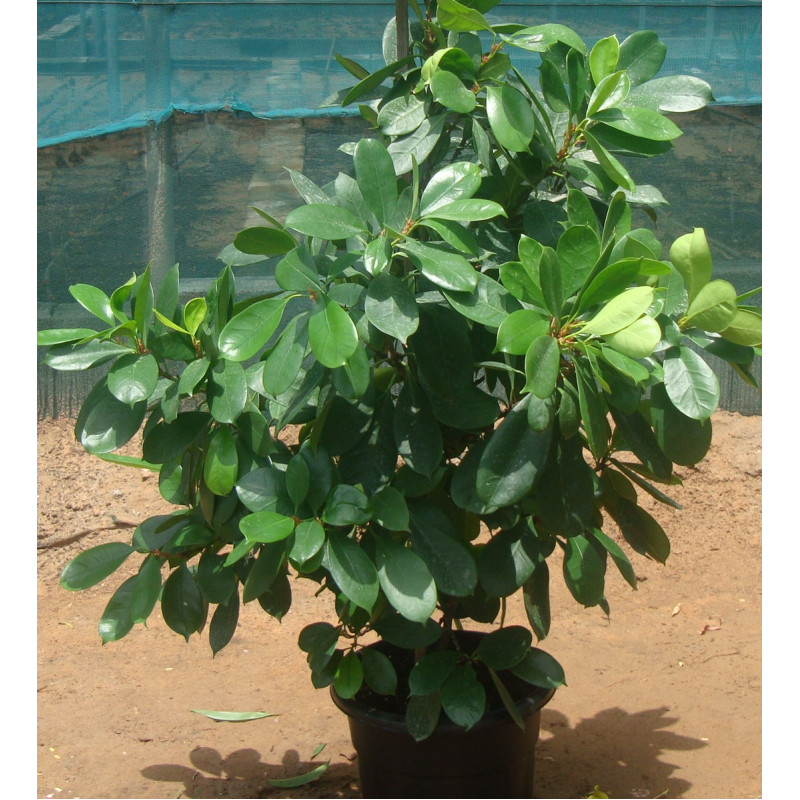 Ficus cyathistipula has rich deep green leaves like a large laurel, 8-10cm long. It makes an ideal screening plant and can grow up to 6m. Not suitable to plant outdoors in full sun, partial shade is best.