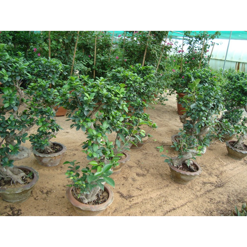 Ficus bonsai, ideal for indoors and partial shady areas. There are hundreds of varieties of the Ficus, but the most popular one for Bonsai is the Ficus Retusa, which is often shaped in an s-curved trunk and has oval, dark green leaves. The Microcarpa, Tigerbark, Willow leaf, Golden Gate and Taiwan varieties are quite similar to the Retusa. The Ficus Ginseng is another popular tree. It has a thick, pot-bellied trunk, similar to the Ginseng root. Sometimes it is grafted with Ficus microcarpa leaves (combining it to a ficus microcarpa ginseng).