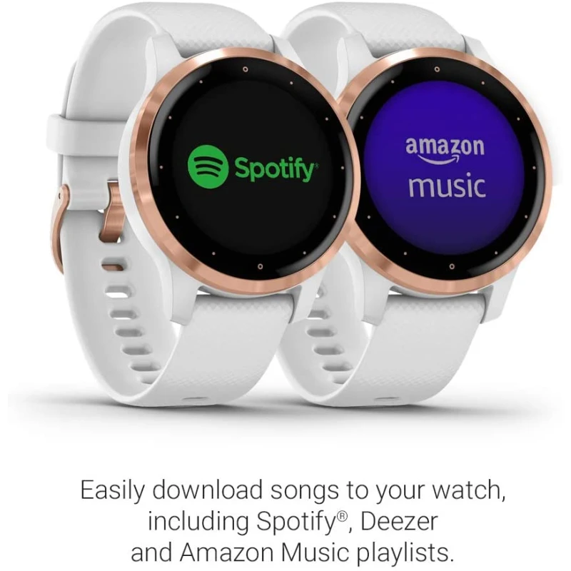 - Easily download songs to your watch, including playlists from Spotify, Amazon music or Deezer (may require a premium subscription with a third-party music provider), and connect with headphones (sold separately) for phone-free listening
