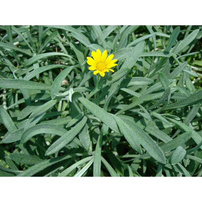 Gazania uniflora or Treasure Flower is spreading, evergreen perennials with glossy leaves, to 15cm long, dark green above, covered with silky white hairs below. In early summer, bear solitary yellow flowerheads, usually zoned in a contrasting colour.