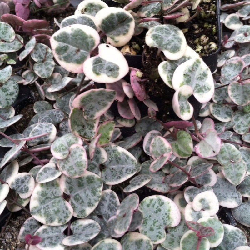 The String of Hearts (Ceropegia woodii) “Variegated” is a trailing succulent-like plant native to South Africa. The delicate heart-shaped foliage and slender vines can reach up to 12′ long in its natural environment, and has earned this plant many nicknames, including Rosary Vine and Sweetheart Vine.