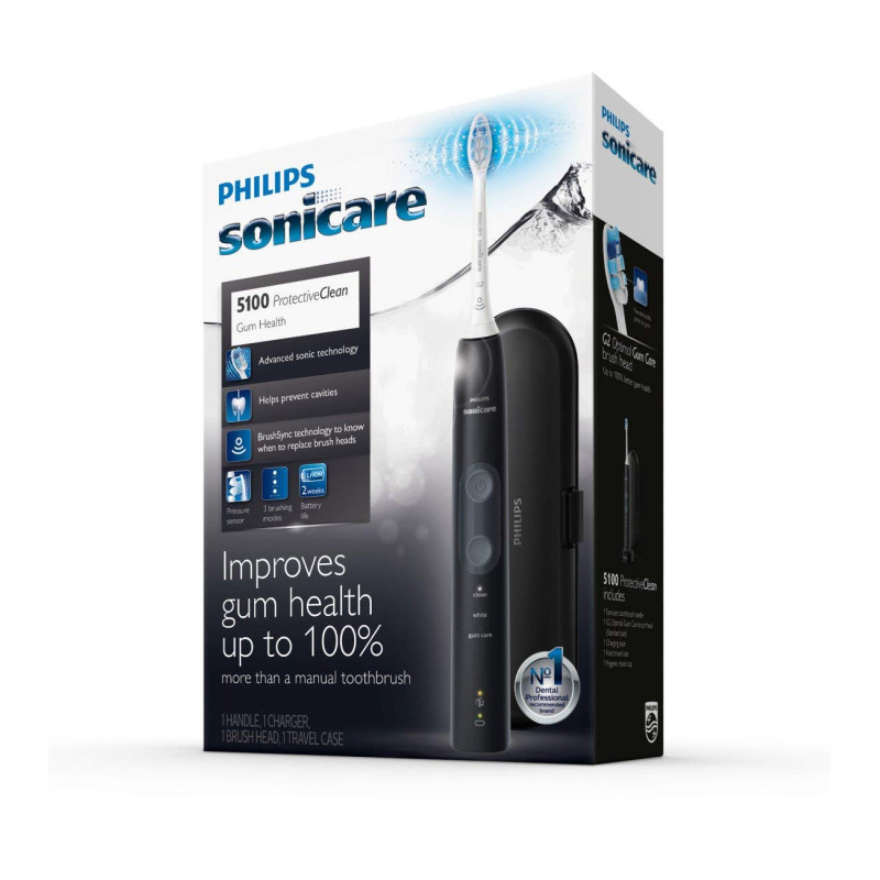 Improve your gum health up to 100% better than a manual toothbrush with the Protective Clean 5100 rechargeable electric toothbrush. It has a pressure sensor that protects teeth and gums from excess brushing pressure. Brush heads wear out over time. Our Brush Sync technology tracks how long you have been using your Optimal Gum Care brush head and how hard you have been brushing. Your electric toothbrush will beep to inform you when to replace your brush head. Customize your own brushing experience with your choice of 3 modes: Clean, White and Gum Care. The easy-start feature slowly increases the power of the brush as you get used to the Sonicare experience and the smartimer encourages a full 2 minutes brushing time as recommended by your dental professional. The battery charge indicator light lets you know when it is time recharge; 2 week battery life. The kit includes 1 Protective Clean 5100 handle, 1 Optimal Gum Care brush head, 1 charger, 1 travel case.Product Feature