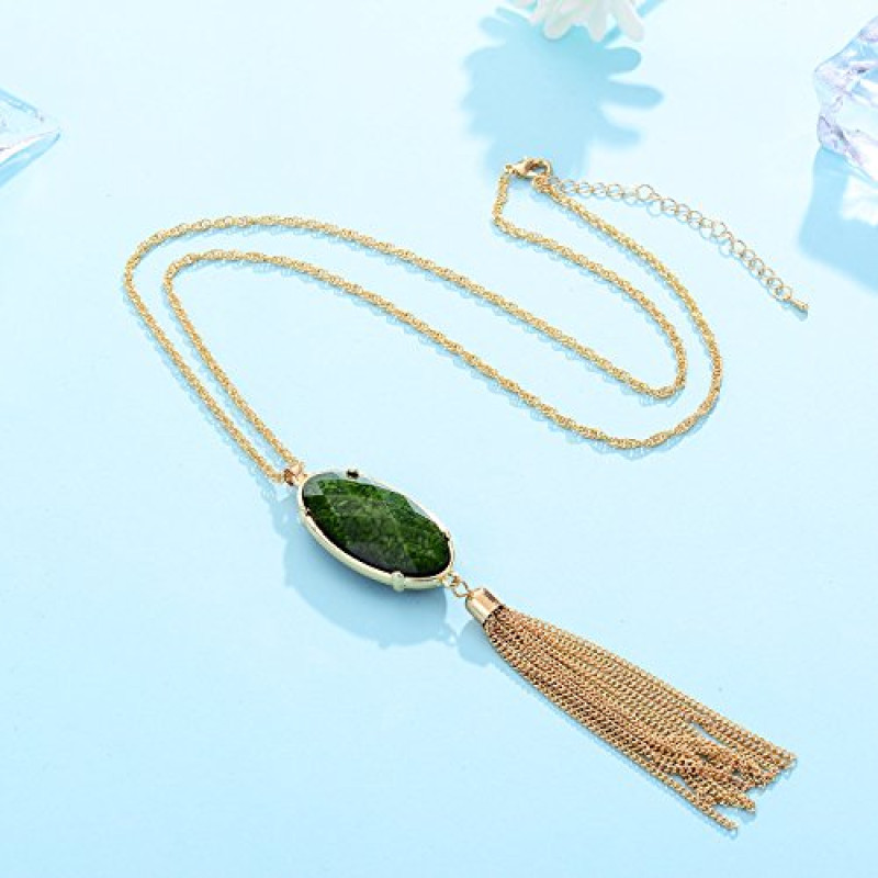 HUIMEI Double Color Oval Shape Stones Reversible Pendant Tassel Necklace