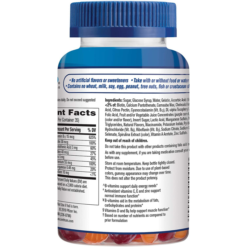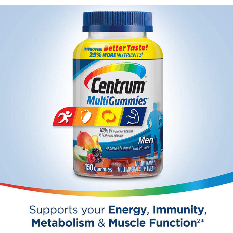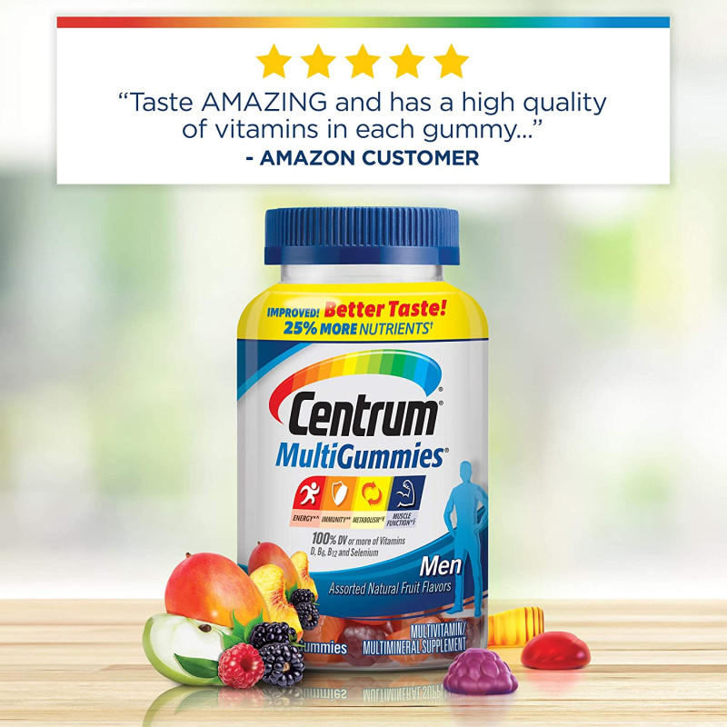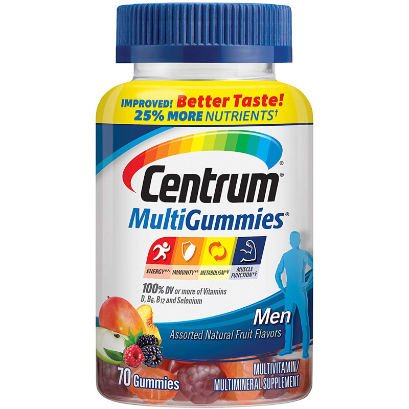 Scent Name:70 CountCentrum MultiGummies Gummy Multivitamin for Men is a great-tasting multivitamin/multimineral supplement that supports men's overall health, containing more vitamin D than any other gummy. With the recommended daily value of vitamin D, B12, B6 and selenium, these gummy multivitamins feed your cells with muscle and energy supplements for men, specially formulated to support your daily energy needs and help support muscle function. Each daily multivitamin for men also contains antioxidant vitamins C, E and zinc for immunity support, and metabolism vitamins to help your body process fats, carbohydrates and proteins effectively. Made with natural cherry, berry and apple flavors, this multipurpose vitamin for men contains no artificial sweeteners and provides a delicious, easy-to-take way to support your body head to toe. Take two of this multivitamin gummy supplement every day. Feed your cells, fuel your life with Centrum, the #1 doctor and pharmacist recommended brand.