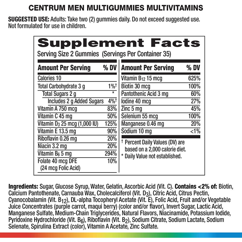 Improved! Better tasting! Centrum MultiGummies Men are a convenient and delicious way to get your daily micronutrients. And they’re gluten-free with naturally sourced colors, and free of artificial flavors or sweeteners.