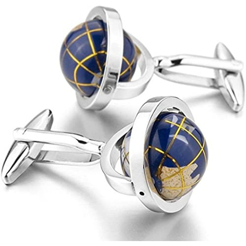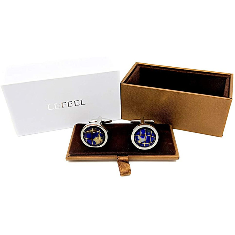 LBFEEL Really Spins Rhodium Plated Blue Globe Earth Cufflinks for Men with a Gift Box