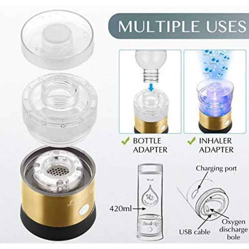 - HYDROGEN WATER IONIZER with BREATHING INHALER and BOTTLE ATTACHMENT included; Hydrogen inhalation gives the option to consume larger quantities of molecular hydrogen in comparison to hydrogen rich water. 10 minutes of hydrogen inhalation is equal to drinking 2 liters of hydrogen rich water.