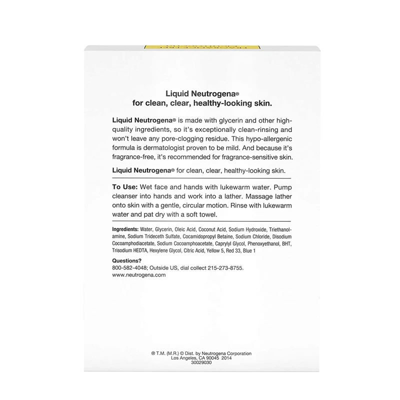 Use Liquid Neutrogena Facial Cleansing Formula to help achieve clean, clear and healthy-looking skin. This glycerin-rich facial cleanser washes away dirt, oil, and bacteria without using harsh detergents and rinses clean without leaving any pore-clogging residue. Both hypoallergenic and non-comedogenic, our daily face wash is dermatologist proven to be mild. The gentle cleansing formula is mild and fragrance-free so it's recommended for skin that is sensitive to fragrance. This wash makes the perfect addition to your daily beauty and skincare routine for an at-home self-care experience.