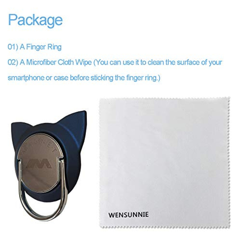 Wipe Free: WENSUNNIE microfiber fabric wipe is packed with this cat phone ring, it is ok to clean your lovely case or smartphone before sticking. The cat ring is Anti-drop, anti-theft clasp and can be used as a kickstand, frees hands and holds devices firmly, more secure and more convenient.Flexible usage: The base part can rotate 360°and drive finger ring rotation, the finger ring can fold 90°, you can place your cell phone anywhere you want. Tilt, prop, grip, provides you with multiple visual angles for watching movies.