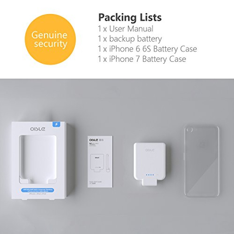 Design Concept: : Generally, people just need to fully charge their phones once in a day. OISLE's design conception is to find a perfect balance between practicability and exquisiteness, and with the best quality. TOP FEATURES: - Li-Polymer Battery - LED Battery Level Indicator - Universal Apple Compatibility - Easy to Use PARAMETER: -Input: DC 5V/1-2A -Output: DC 5V/1A MAX -Capacity: 2200mAh -Weight:51g -Size:2.28 x 3.15 x 0.3in -Certificate: GB4943.1 & GB5296.2 & GB/T18287-2000 CE, FCC & RoHS -Charging mode : slow/quick (press function button for 3sec to switch) NOTE: The capacity is 2200 mAh. Dear supporters, please think it through before purchasing, the portability is inversely proportional to the capacity, and it's not available to get them simultaneously. We will do as perfect as possible. USB charging cable is not included, you can use your iPhone lightening cable to charge it. Compatible with: iPhone 7, iPhone 6/ 6S, iPhone 5/5S. INSTRUCTIONS: -Automatically charge with slow charge mode(default mode) -Press ON/OFF button 3 seconds to start QUICKER charge BOX CONTENT: -1 x backup battery -1 x iPhone 6 6S Battery Case -1 x iPhone 7 Battery Case -1 x User Manual OISLE Manufacturer Warranty: OISLE offers a 1-year manufacturer limited warranty that will protect you against all defects in material and workmanship. 1, Please do not bend the lightning port of the Mini Power Bank. It is very easy to bend. Please take care of it. 2, Generally speaking, the Mini Power Bank can not used in the iPhone case's thickness > 1mm. Only fit for the cell phone case < 1mm. 3, Please insert & pull the Mini Power Bank in Horizontal line with iPhone.Product Feature